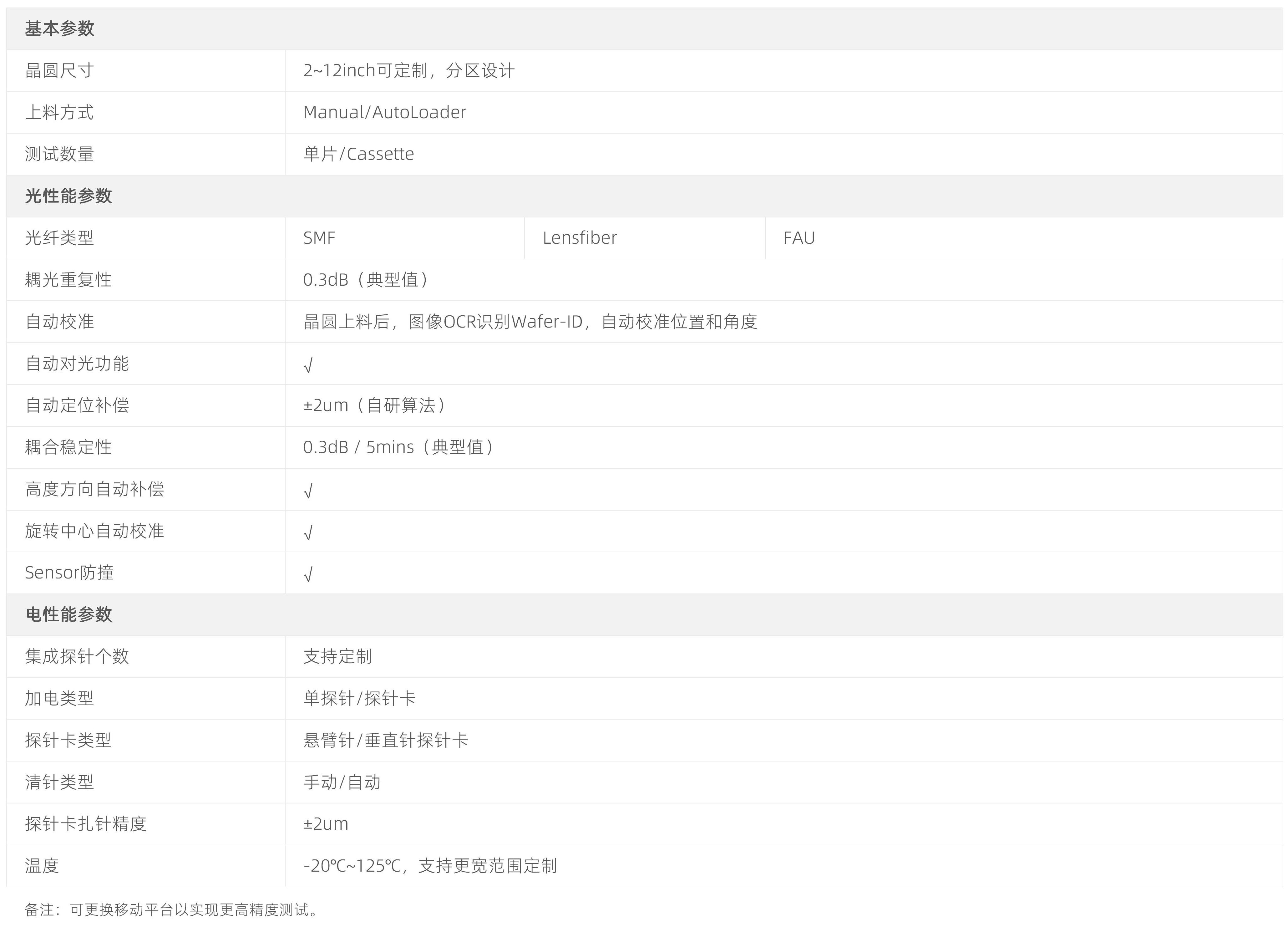 該設備(bèi)主要麵向矽光OO、OE等前沿技術測試領域,光測試兼容SMF、Lens Fiber、FA等;電測試兼容探針座或探針卡,滿足研發及量產多種應用場景測試需求。