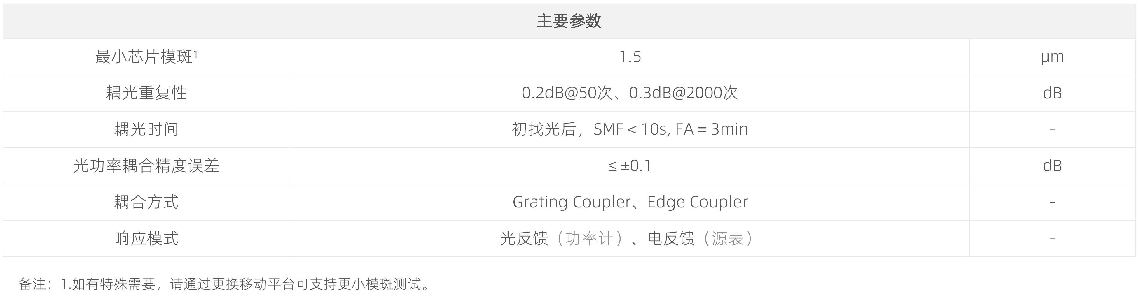 該(gāi)係(xì)統適用於多種類型無源/有源芯(xīn)片(piàn)、Bar條測試,滿足量產及研發等多種應用場景,配合儀表可(kě)測試(shì)IL、ER、RL、FSR、響應度(dù)等芯片相(xiàng)關性能指標(biāo)。