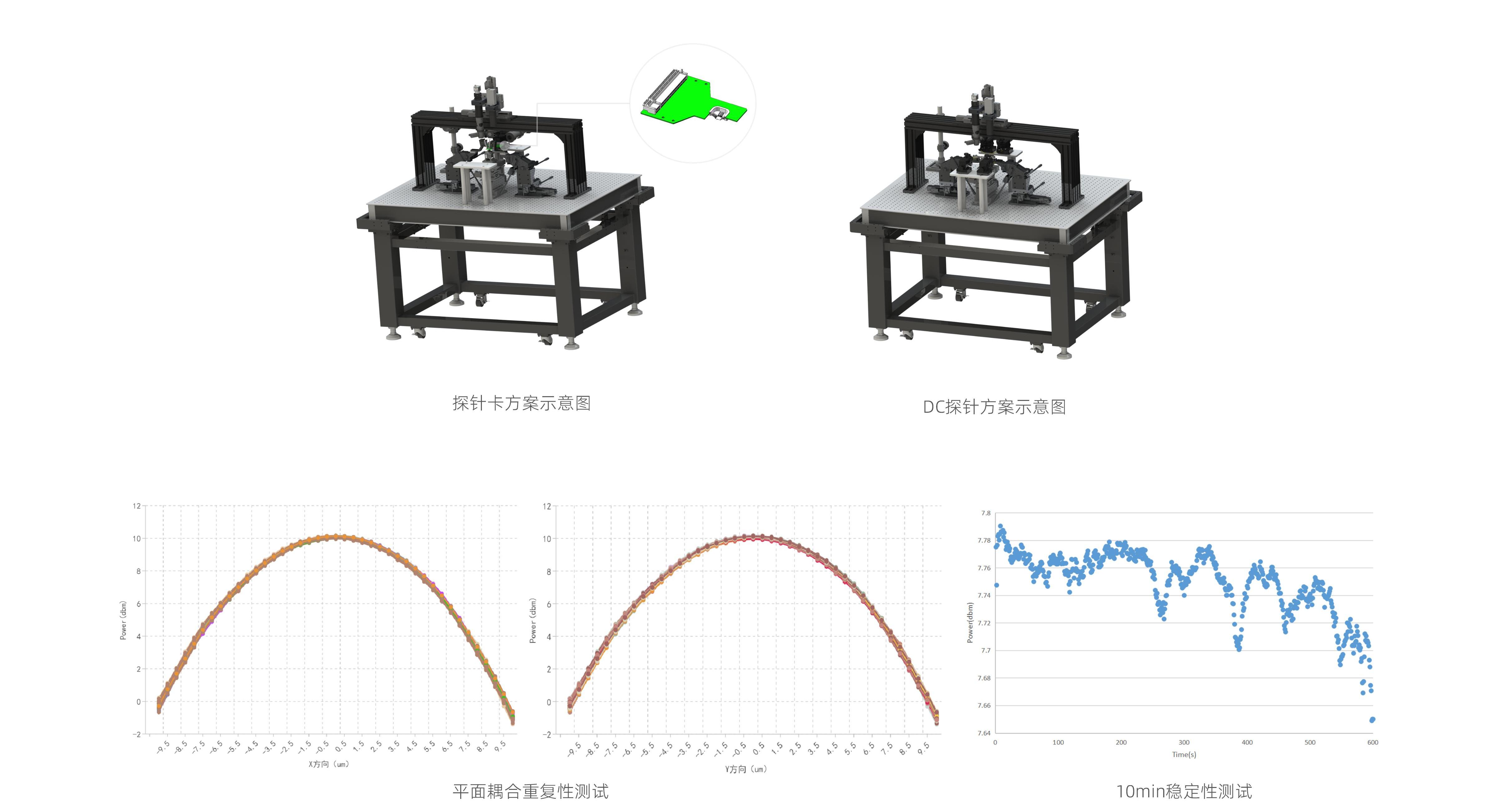 CA-6000 芯片自動耦合測試(shì)係統由亞微米級高精度移動平台、高(gāo)性(xìng)能隔振(zhèn)係統、多方(fāng)位視覺檢測係統構建而成。該(gāi)係統采用自主研發上位機軟件、融(róng)合圖像(xiàng)識別及人工智能算法,實現自動對光、自動壓接探針卡等操作,中間過程無需人(rén)工參與,大大提高測(cè)試效率及精確度,進一步為(wéi)客戶降本增效。